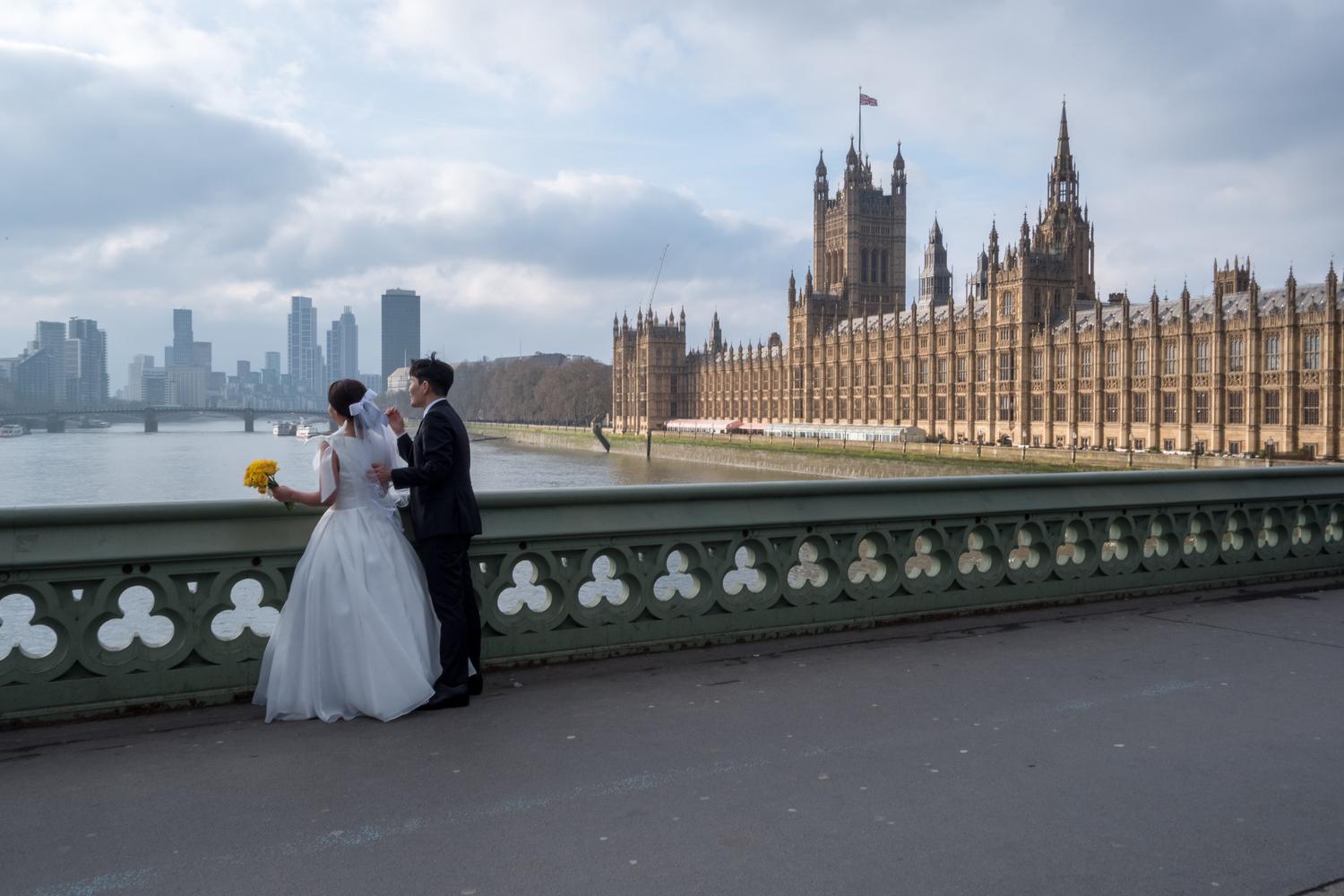 A couple in wedding attire on Westminster Bridge, overlooking the Thames.